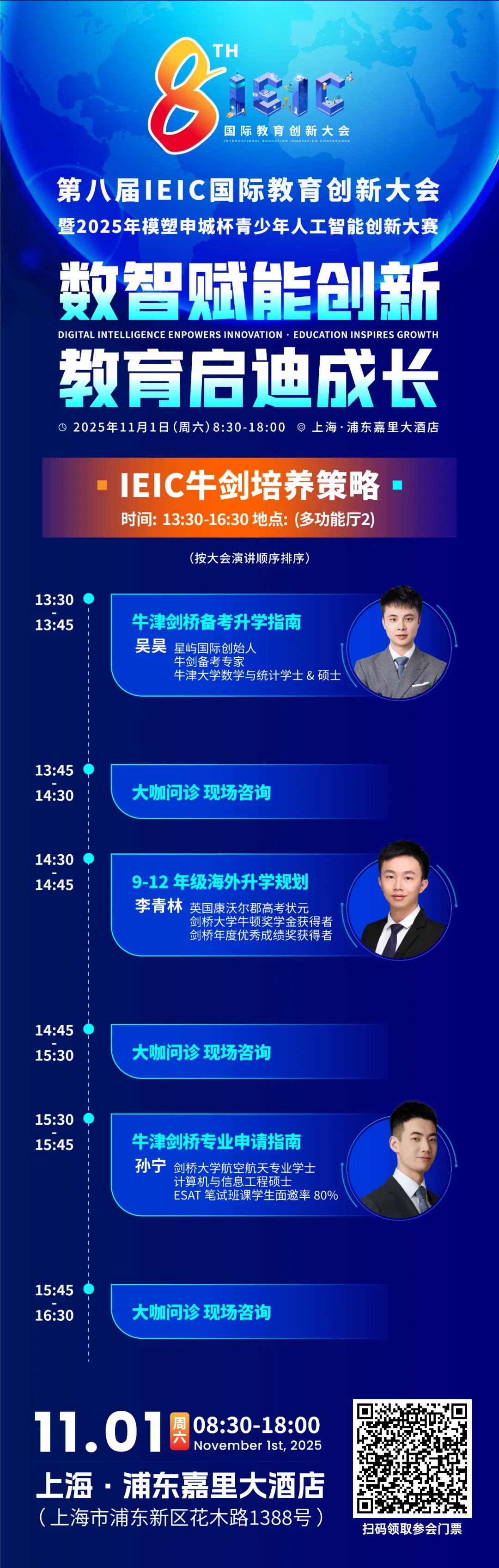面對牛津大學和劍橋大學“少而精” 的招錄模式、逐年提升的申請難度,聚焦家長與學子核心需求的“IEIC牛劍培養(yǎng)策略”分論壇應運而生。本次論壇將由牛劍畢業(yè)校友分享成功錄取經驗,資深牛劍備考專家全方位拆解牛劍及G5院校的申請策略,更有“大咖問診”環(huán)節(jié),一對一為家長診脈,分享差異化的培養(yǎng)規(guī)劃,打造孩子的競爭優(yōu)勢。