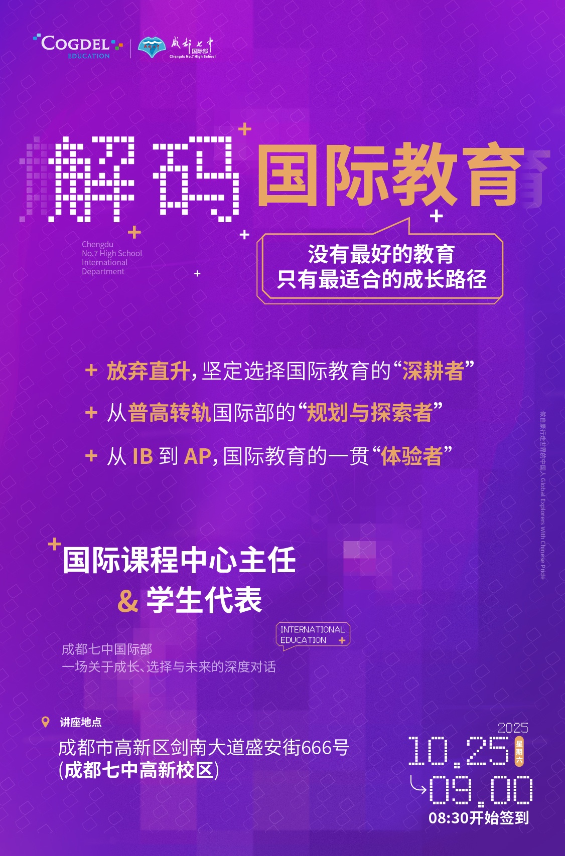 親愛的家長們,成都七中國際部 “解碼國際教育” 主題講座即將于 2025 年 10 月 25 日開啟!這場關于成長、選擇與未來的深度對話,將為您揭開國際教育的神秘面紗,助力孩子找到適合的成長路徑。